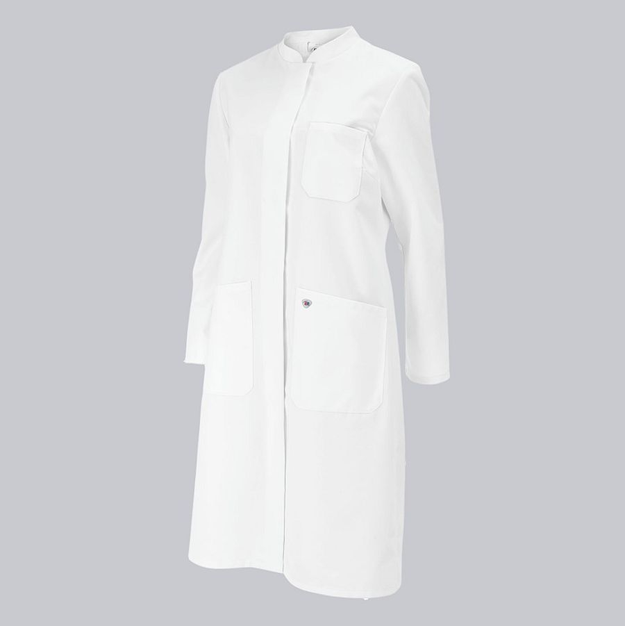 Der figurbetonende Damenmantel 1614 130 von BP Med & Care besitzt einen modernen Stehkragen und verdeckte Druckknöpfe. Durch die Verwendung reiner Baumwolle ergibt sich ein hervorragender Tragekomfort.
