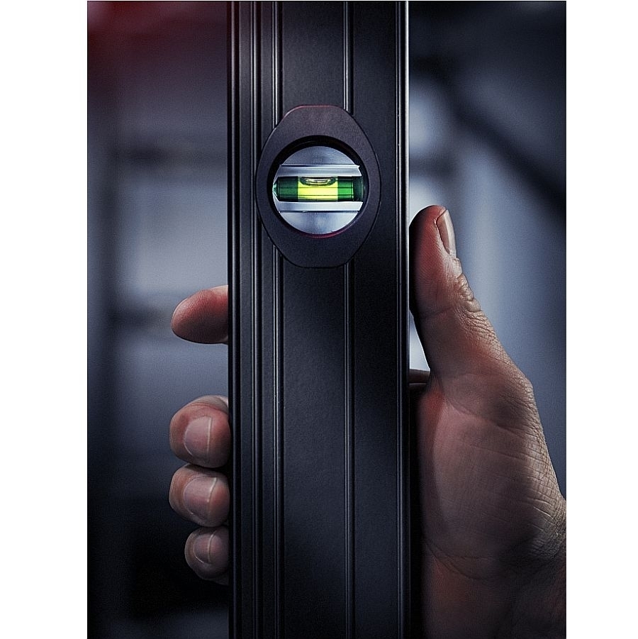 Extra starkes Aluminiumprofil mit den Abmessungen 59x26 mm und einem Gewicht von ca. 880 g/m. Unzerbrechliche Blocklibellen mit sehr hoher Transparenz und Haltbarkeit. Waagerechtlibelle mit Vergrößerungslinse (+30 %) und Leuchtbelag. Stoßdämpfende Endkappen und temperatursichere Libelleneinfassungen.