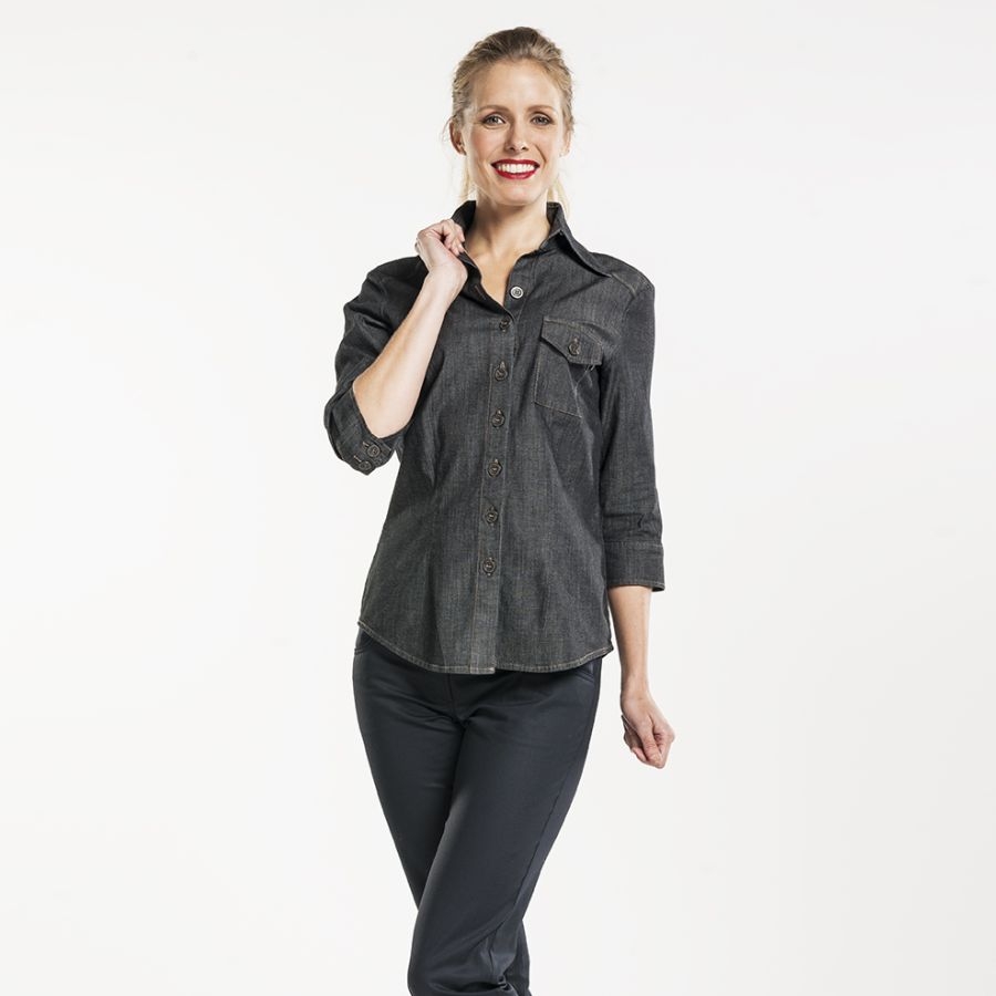 Die Pure Denim Kollektion zeigt Stärke und Charakter … Daher ist sie die perfekte Verschmelzung von Mode und Arbeitskleidung. Richtiger Denim lebt! Häufiges Waschen lässt den Stoff aufleben. Waschen und behandeln Sie ihn ganz nach eigener Vorliebe und schaffen Sie sich auf diese Weise eine ganz eigene Identität. Zeigen Sie Mut zum Kombinieren und finden Sie das Modell, das Ihnen wie auf den Leib geschnitten ist! Die Pure-Denim-Artikel sind nicht für Industriewaschmaschinen geeignet. Alle lieben Denim! Diese taillierte Damenbluse hat eine stylische Passform. Durch das Stretch-Material ist die zeitlose Bluse komfortabel zu tragen. Unter anderem durch die praktischen Dreiviertelärmel perfekt für das Service Personal.