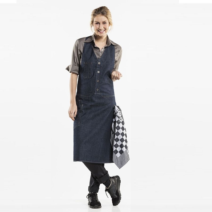 Die Pure Denim Kollektion zeigt Stärke und Charakter … Daher ist sie die perfekte Verschmelzung von Mode und Arbeitskleidung. Richtiger Denim lebt! Häufiges Waschen lässt den Stoff aufleben. Waschen und behandeln Sie ihn ganz nach eigener Vorliebe und schaffen Sie sich auf diese Weise eine ganz eigene Identität. Die Bistro zeichnet sich durch ihre praktische Funktionalität aus. Diese Latzschürze hat eine große Tasche, eine kleine Brusttasche und eine Schlaufe fürs Geschirrtuch. Mit den Stickereien, Knöpfen und dem V-Ausschnitt ähnelt die Latzschürze einer Weste, aber die erdige Farbe trägt zum echten, unverfälschtem Look bei.