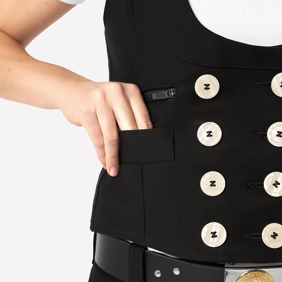 Die Zunftweste "Karla" Zwirn-Doppel-Pilot 70115 von FHB vereint klassische Handwerksästhetik mit moderner Funktionalität. Gefertigt aus 100 % hochwertiger Baumwolle mit einer Materialstärke von 520 g/m² bietet diese Weste nicht nur Robustheit, sondern auch höchsten Tragekomfort. Der ergonomisch gestaltete Halsausschnitt und die durchdachte Passform sorgen für Bewegungsfreiheit und langanhaltenden Komfort – ideal für den anspruchsvollen Arbeitsalltag. Mit zahlreichen funktionellen Details ist die Weste ein zuverlässiger Begleiter. Sie verfügt über 2 geräumige Außentaschen und eine praktische Handy-Außentasche mit Reißverschluss, die wichtigen Utensilien sicheren Stauraum bieten. Zusätzlich sorgt eine Innentasche mit Reißverschluss für Ordnung und Schutz. Die Rückseite besteht aus 300 g/m² schwerem Körpergewebe aus Baumwolle, das zusätzliche Stabilität gewährleistet, ohne die Beweglichkeit einzuschränken. 8 elegante Perlmuttimitat-Knöpfe verleihen der Weste ein stilvolles Design, das durch die zweireihige Knöpfung abgerundet wird. Die Taille lässt sich individuell anpassen, dank der cleveren Taillenregulierung mit 2 Schnallgurten. Die Weste ist in der klassischen Farbe Schwarz (20 Schwarz) erhältlich und bietet eine flexible Größenvielfalt von 34 bis 46, um eine perfekte Passform für jede Trägerin zu gewährleisten.