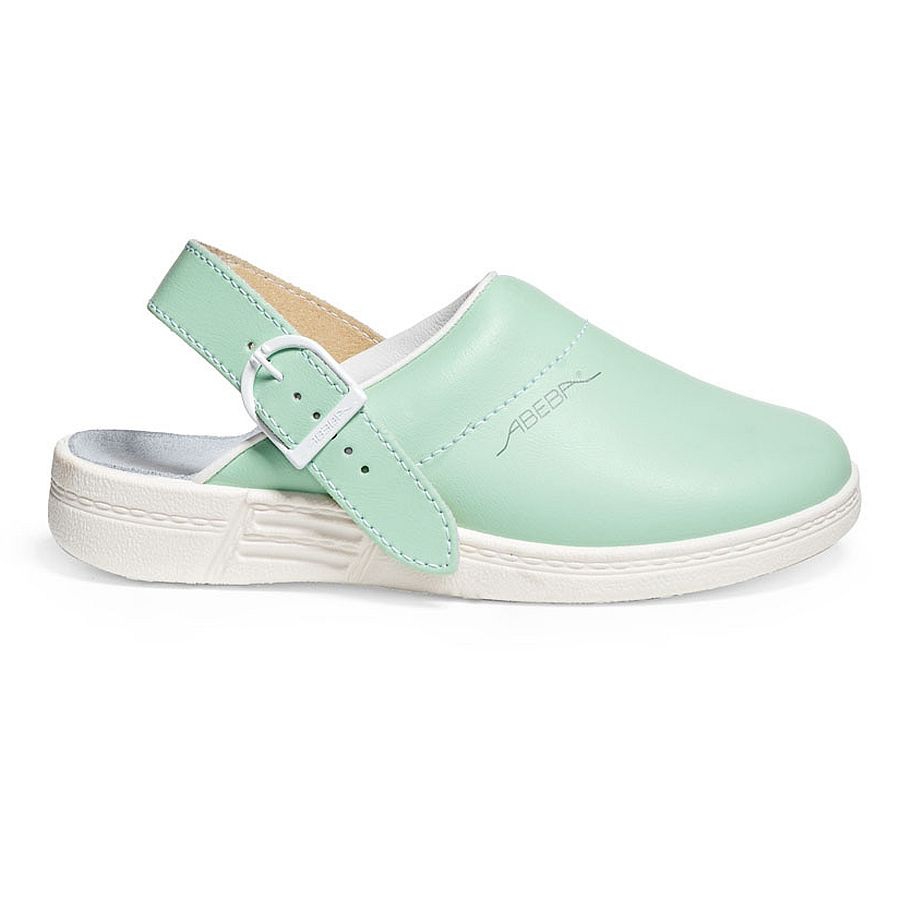 Leichter und bequemer Abeba Clog mit mintfarbenem Oberleder. Die rutschemmende Sohle sorgt für einen sicheren Halt auch bei schwierigen Bodenverhältnissen.