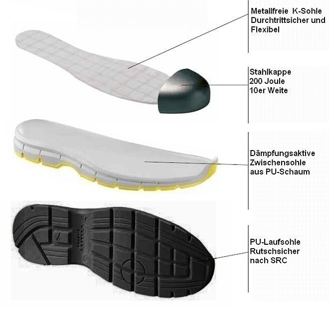 - Atmungsaktive, metallfreie und durchtrittsichere K-Sohle