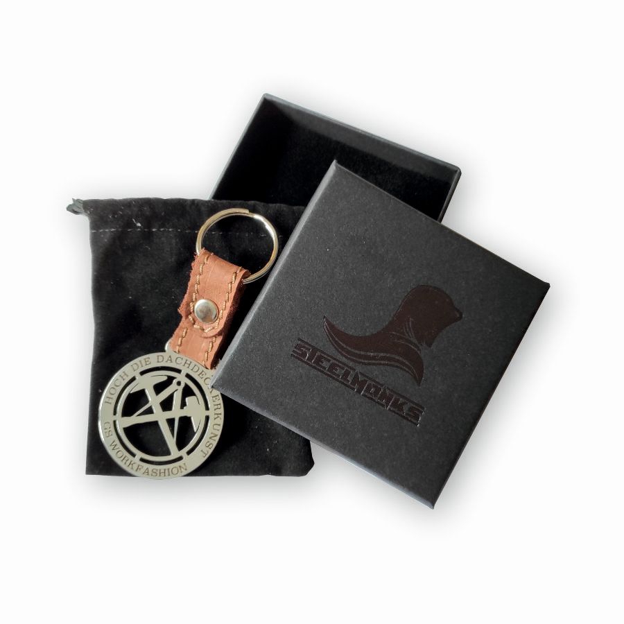 Entdecken Sie unseren exklusiven Zimmermann-Schlüsselanhänger aus hochwertigem Edelstahl mit einem elegant abgesteppten, braunen Lederband. Dieses wetterfeste und langlebige Accessoire, verziert mit dem Zunftzeichen der Zimmermänner, ist das perfekte Geschenk. Jeder Schlüsselanhänger wird in einer edlen Geschenkbox mit Samtbeutel geliefert. Ideal für den anspruchsvollen Handwerker.